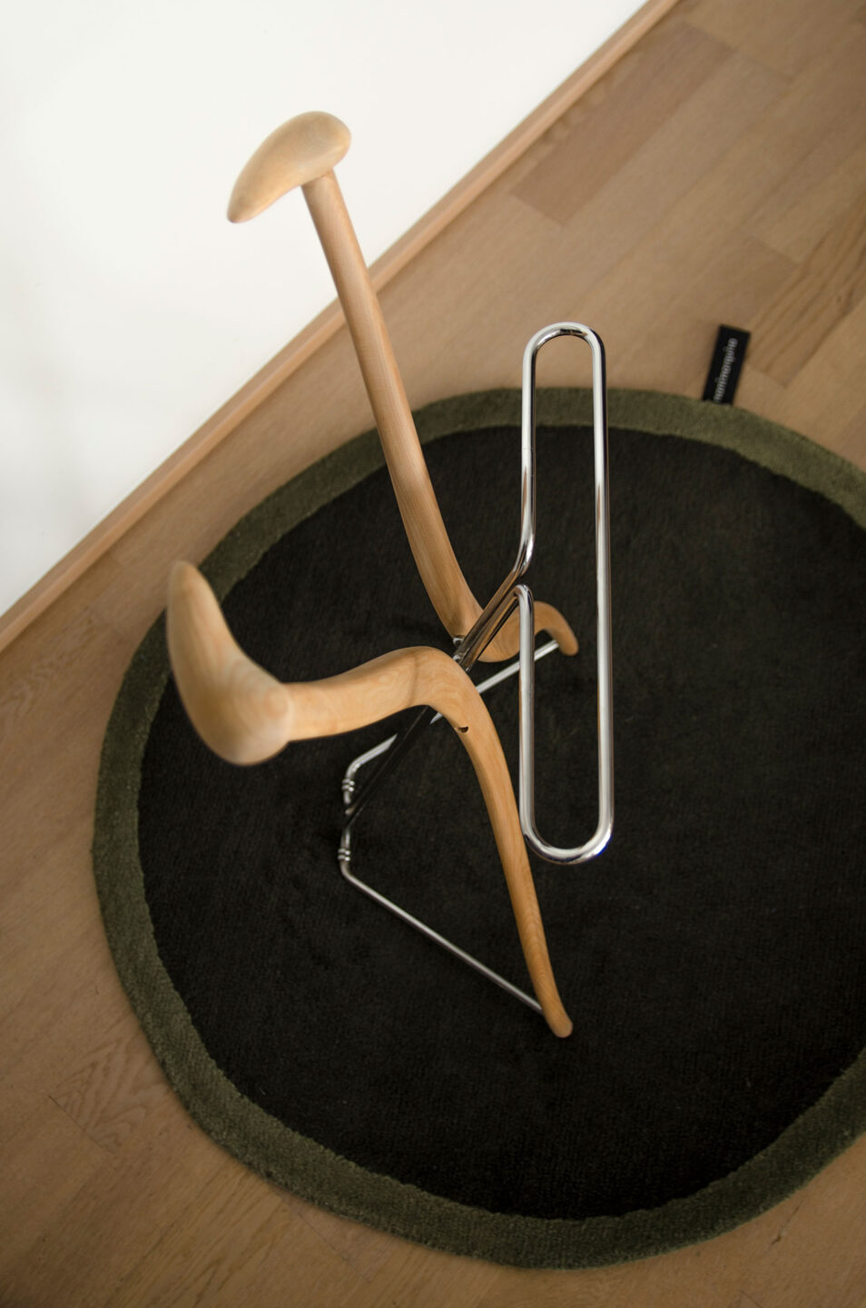 Su estructura de madera de haya curvada se complementa con líneas rectas que ayudan a evocar aquellos elementos musicales en los que está inspirado.