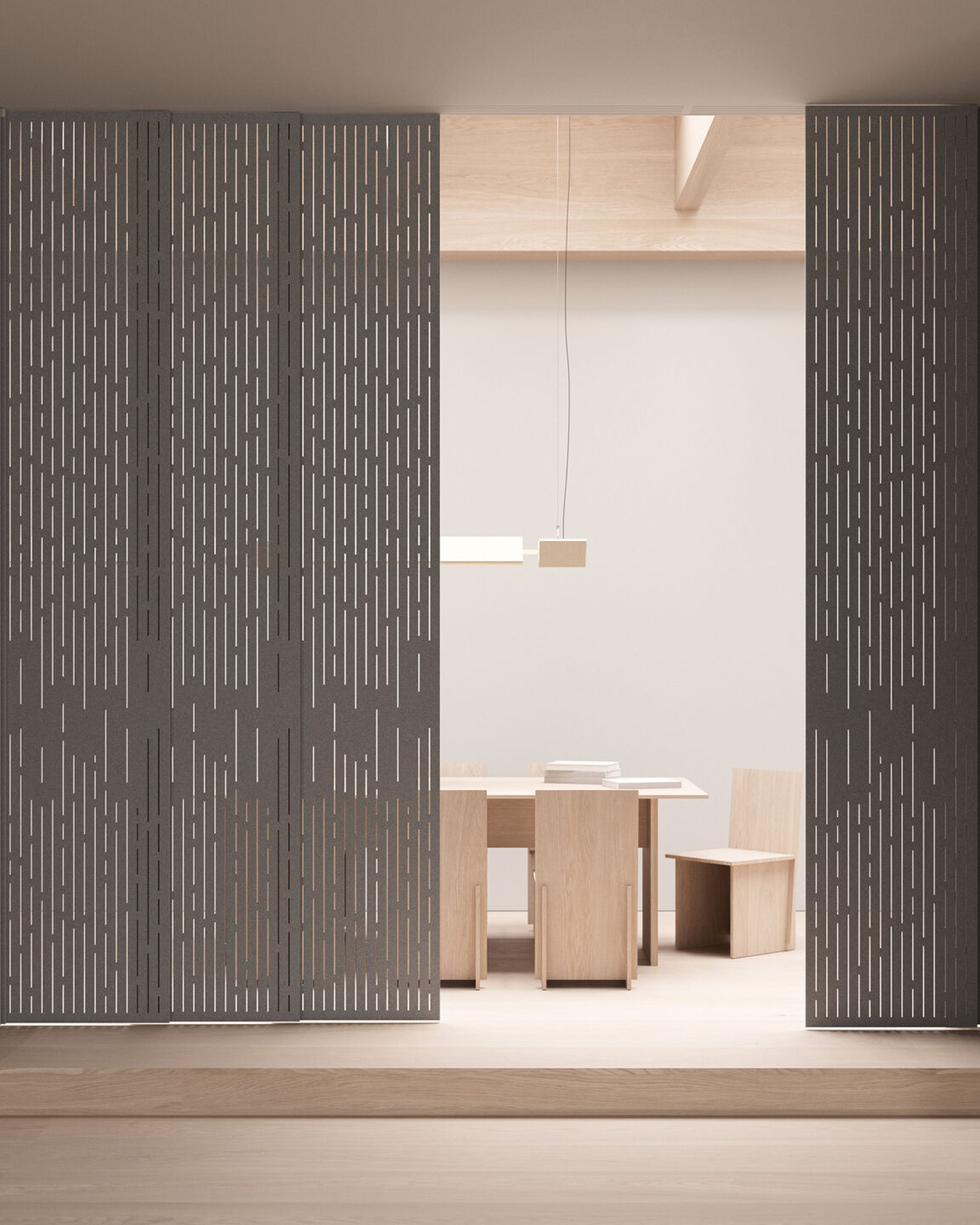 Cotilla es un panel acústico colgante de con sistema corredero inspirado en los paneles japoneses, creado para aportar ligereza, funcionalidad y estética. Su formato suspendido permite dividir espacios, mejorar la acústica y ofrecer privacidad sin necesidad de estructuras fijas.